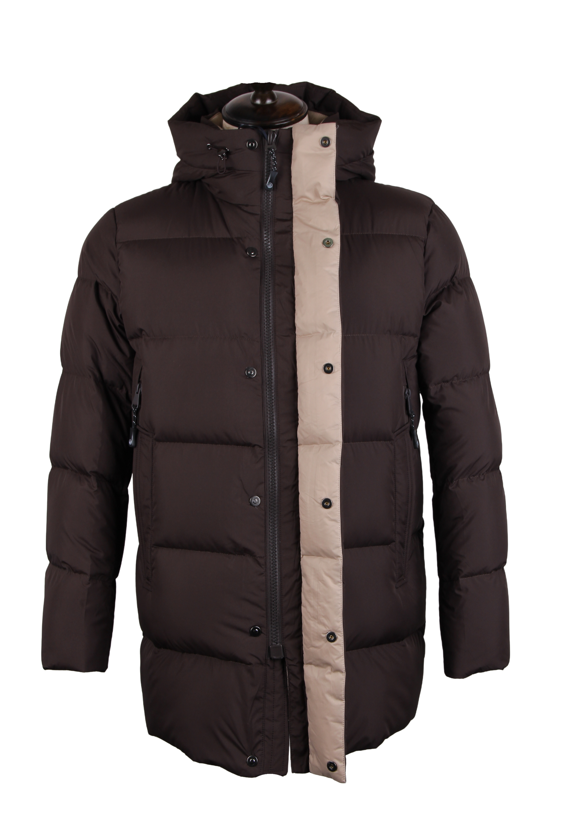 Design: The main color is dark brown, while the inner lining and front placket are a light beige.