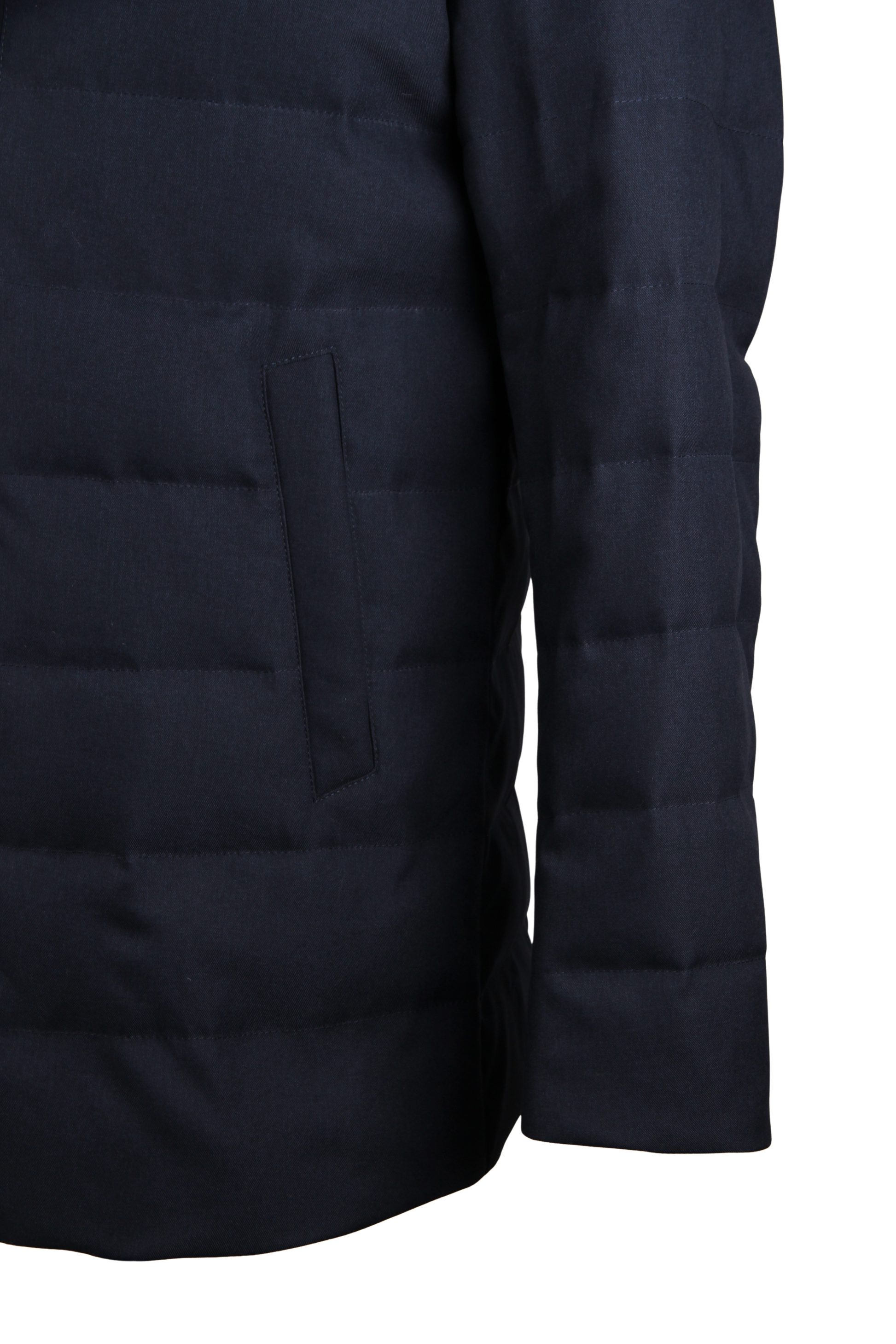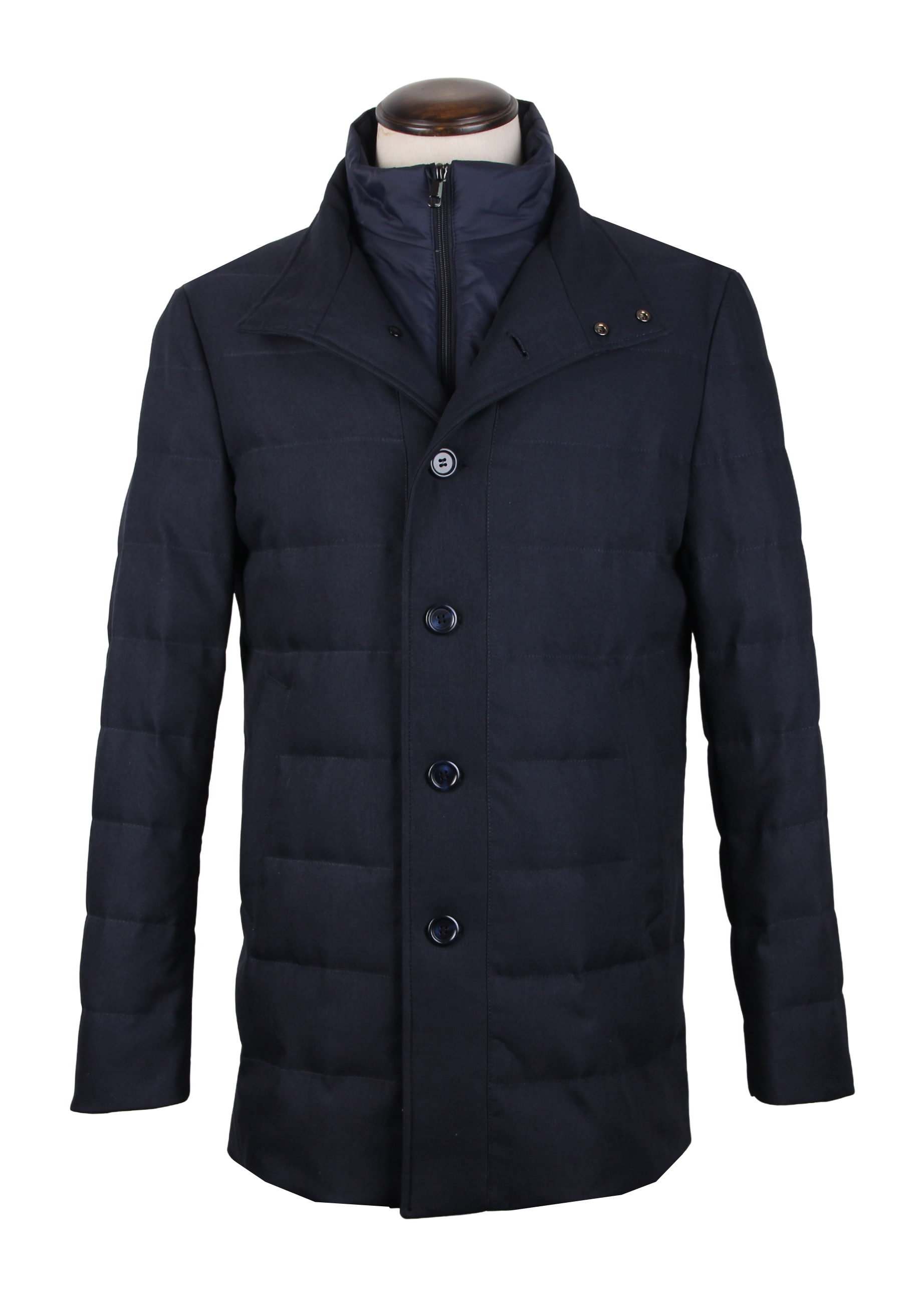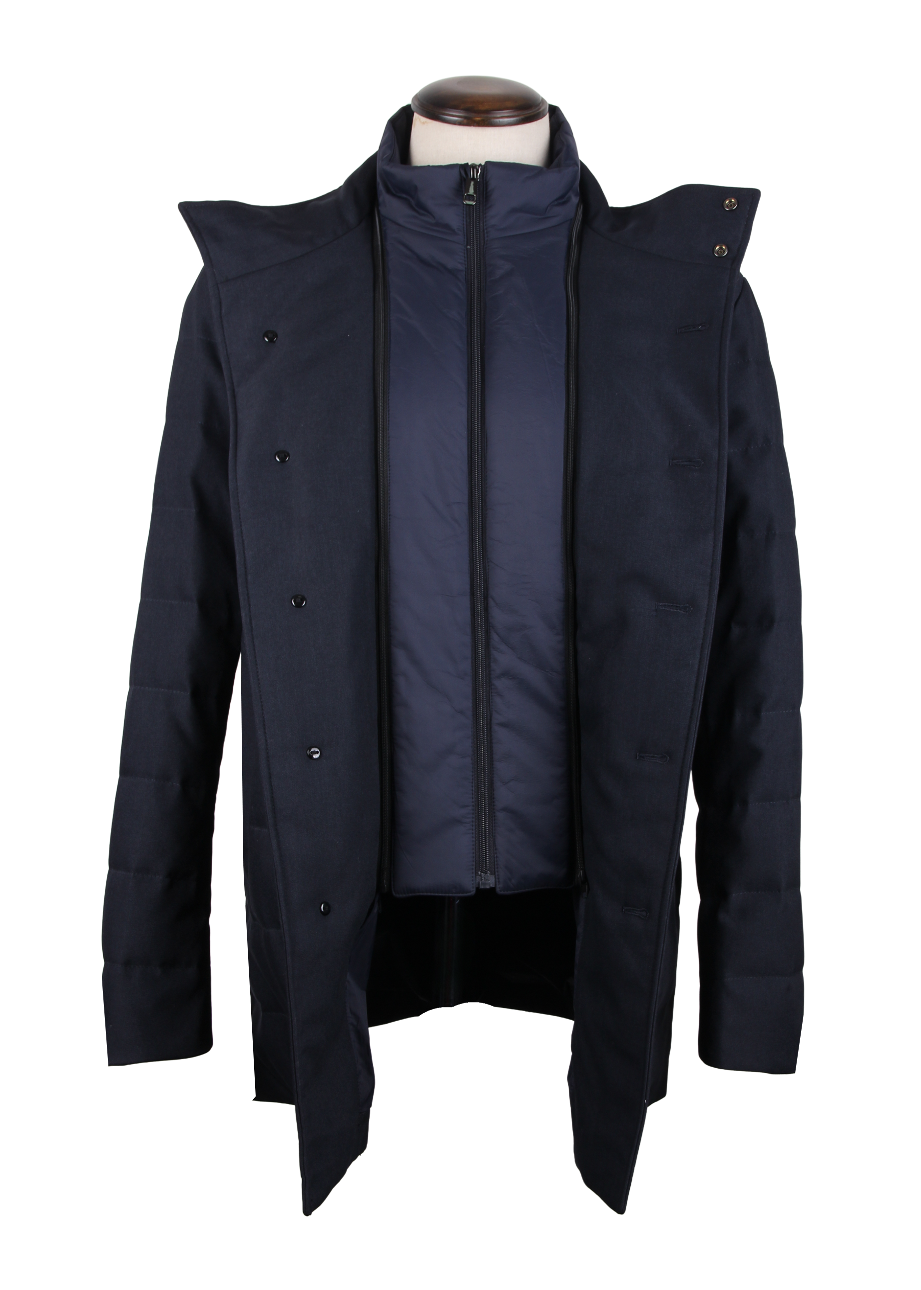 Двойная конструкция: внешний слой имеет четкую конструкцию с застежкой на пуговицы, а внутренний слой обеспечивает комфорт и дополнительное тепло благодаря воротнику-стойке на молнии и пуховой подкладке.