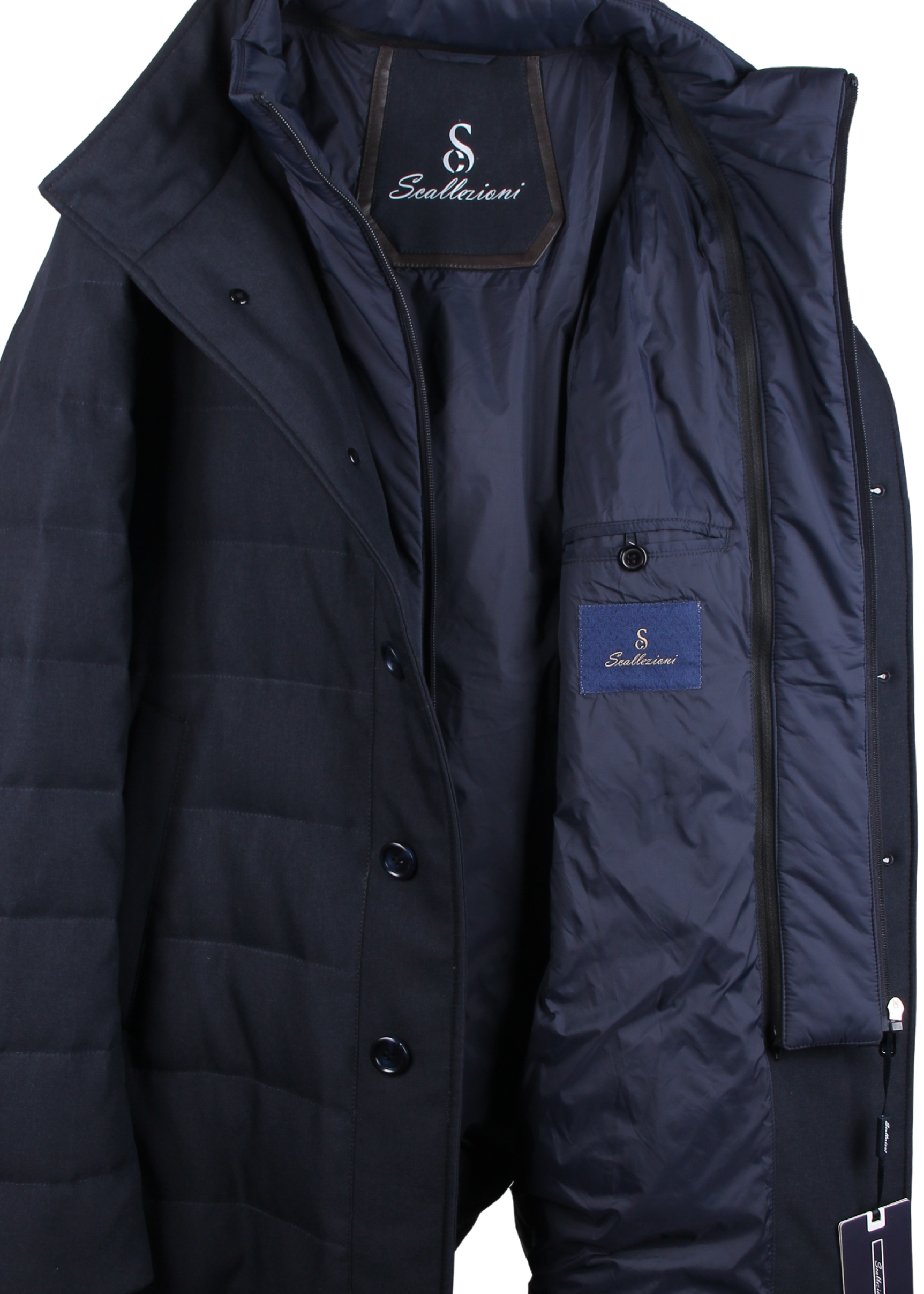 Эта темно-синяя куртка средней длины от Scallezioni, сочетающая элегантность и практичность, идеально подходит для прохладной погоды. Куртка отличается стильным двухслойным кроем: аккуратный внешний слой с классической застежкой на пуговицы и внутренняя часть с застежкой-молнией и высоким воротом, наполненная пухом для превосходной теплоизоляции.