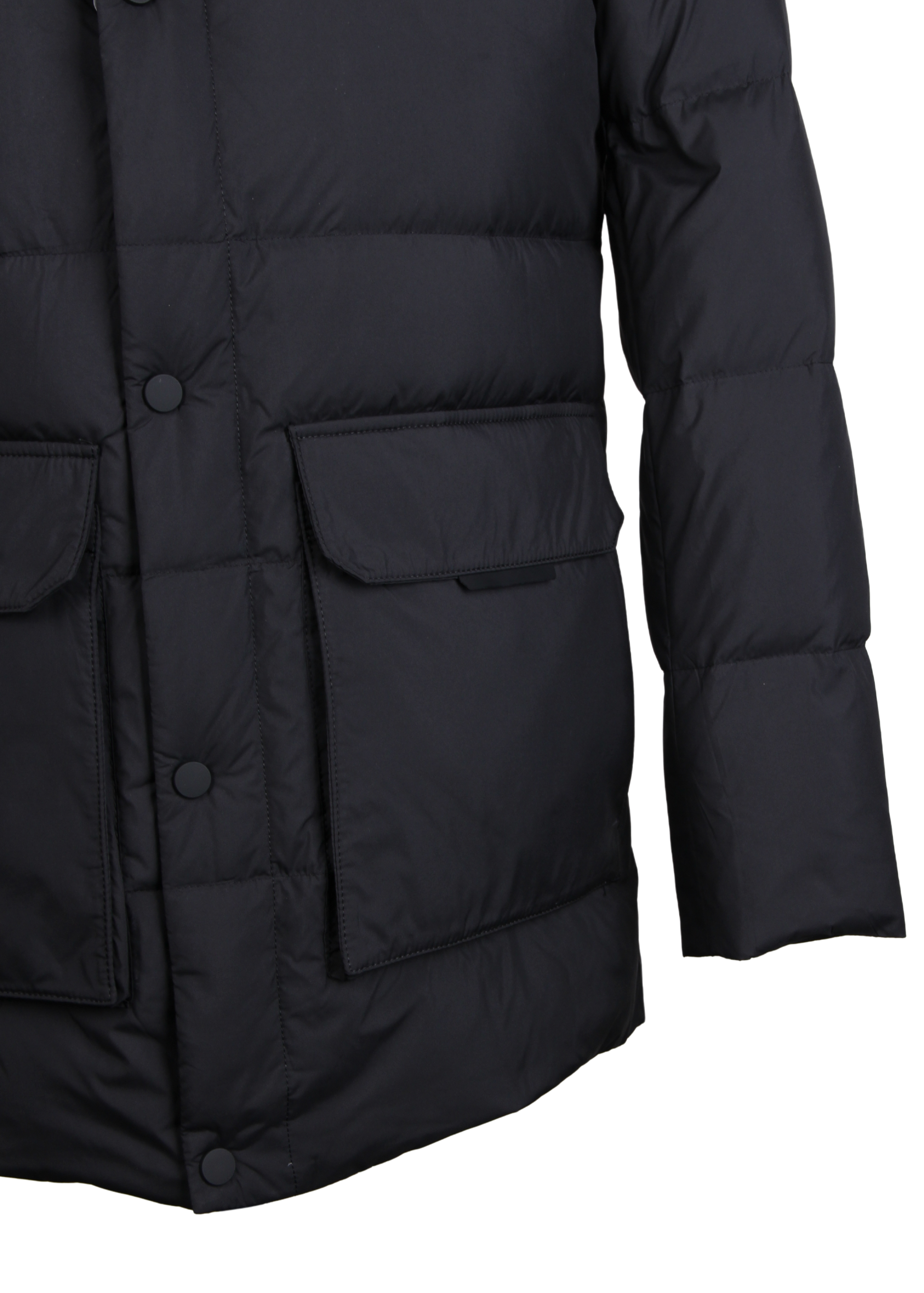 Эта чёрная куртка с капюшоном, сочетающая элегантность и функциональность, согреет вас в холодную погоду, не жертвуя стилем. Стёганый крой с современными, чёткими линиями идеально подходит для динамичного городского образа жизни. Регулируемый капюшон, практичная застёжка на магнитную кнопку и молнию спереди, а также большие карманы с клапанами делают эту модель практичной и элегантной.