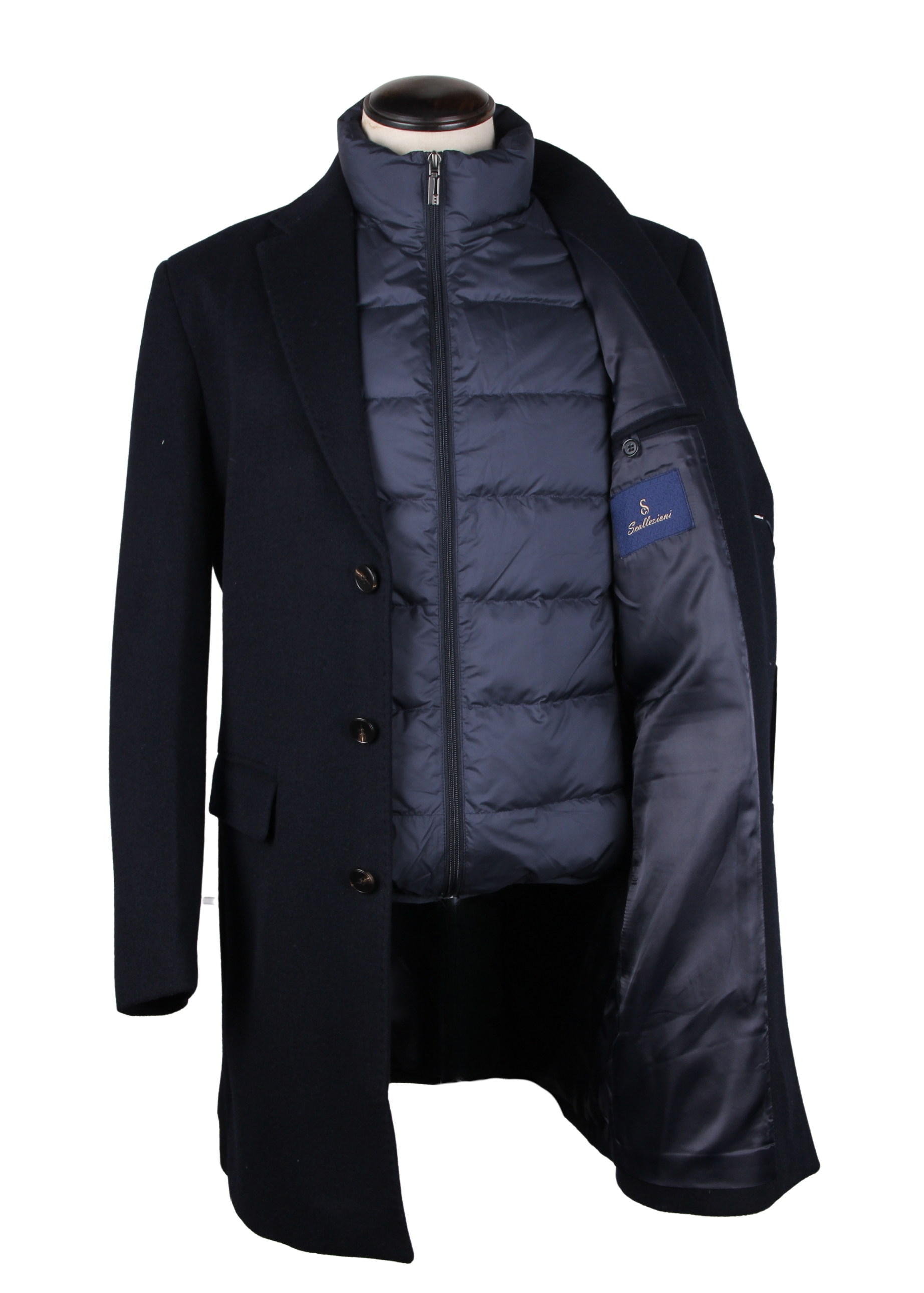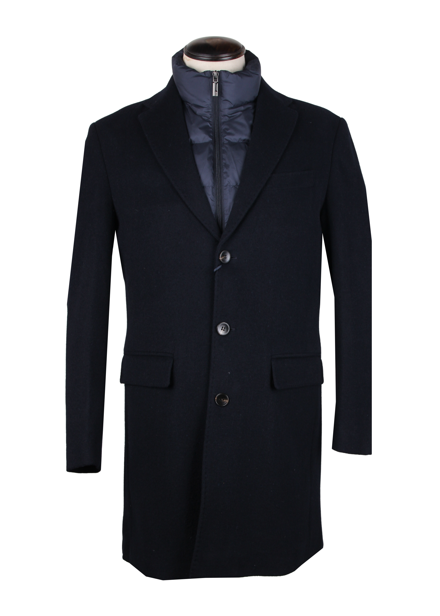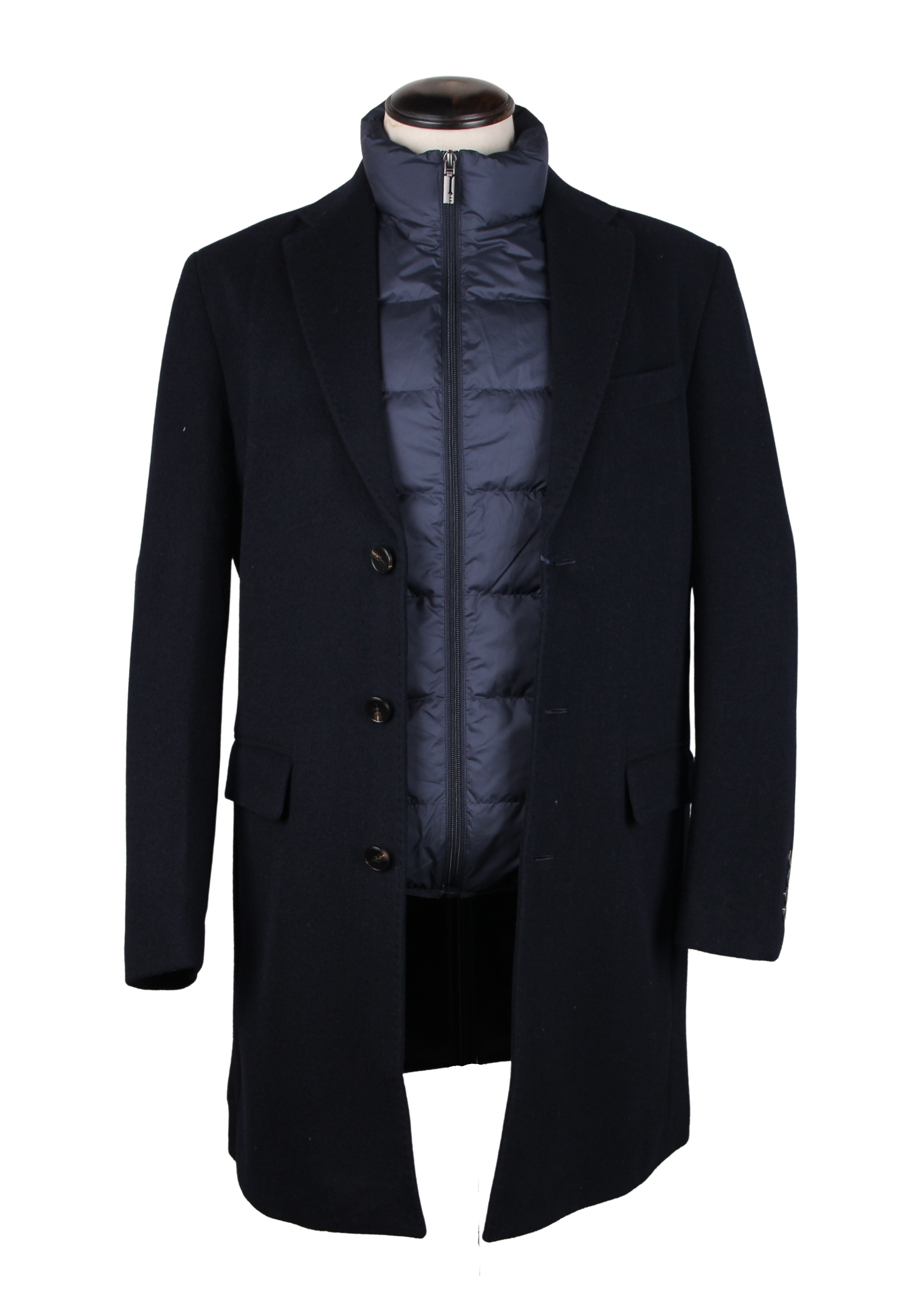 Главное преимущество этого пальто — полностью отстегивающийся пуховый жилет на молнии. Это позволяет надевать его поверх других вещей для максимального тепла в холодную ветреную погоду или снимать жилет, чтобы носить пальто как более лёгкое верхнее пальто из кашемира в более тёплую погоду.